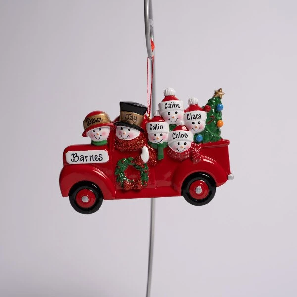 This ornament features a snowman family of 6 hauling their tree home in the back of a red truck. It can be personalized and measures 3.25 inches in height.
