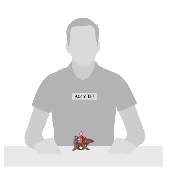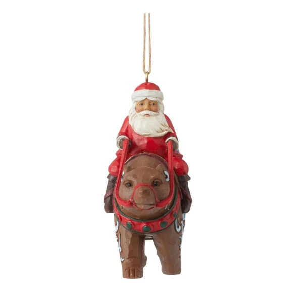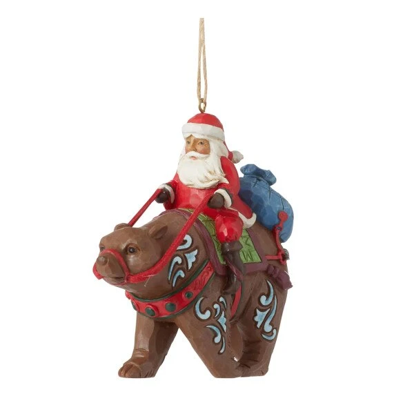 Santa is riding on a bear, loaded with presents to share. This ornament measures 3.94 inches in height.