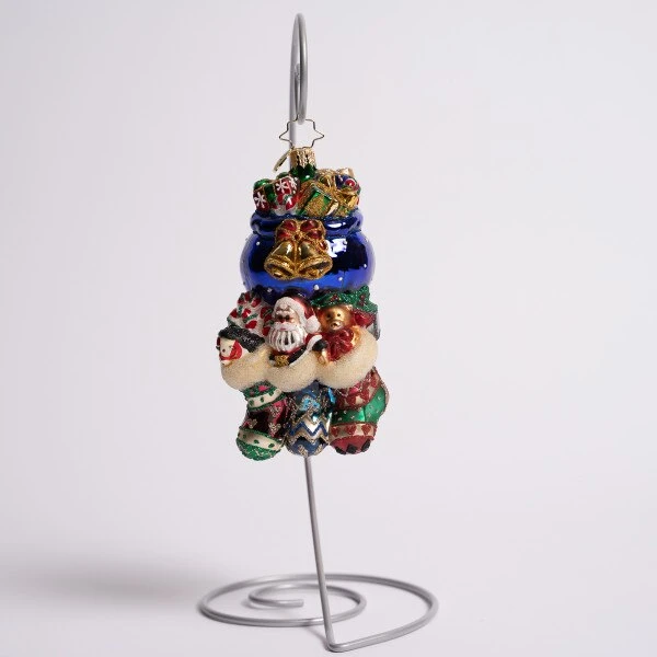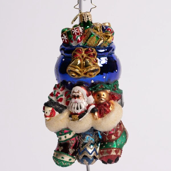 With stockings and toys, and gifts all around, we know Santa was here but can he be found. This Christopher Radko glass ornament measures 5 inches in height.