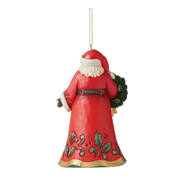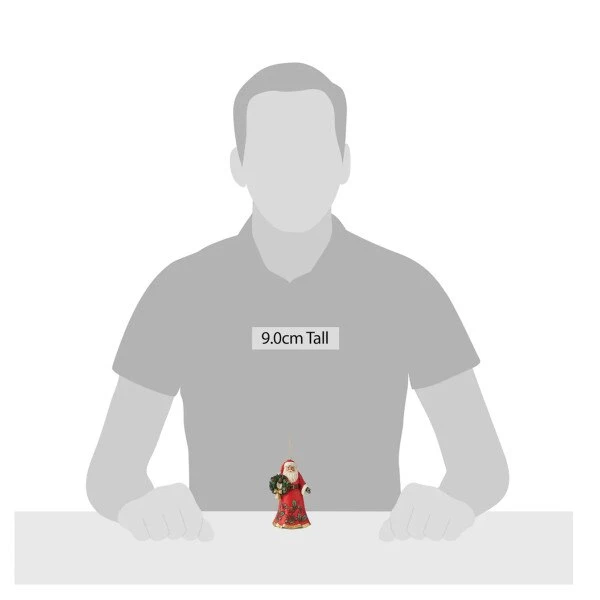 Santa is holding a wreath in his hand with holly leaves, it matches the holly on his cloak he is wearing. This ornament measures 4.53 inches in height.