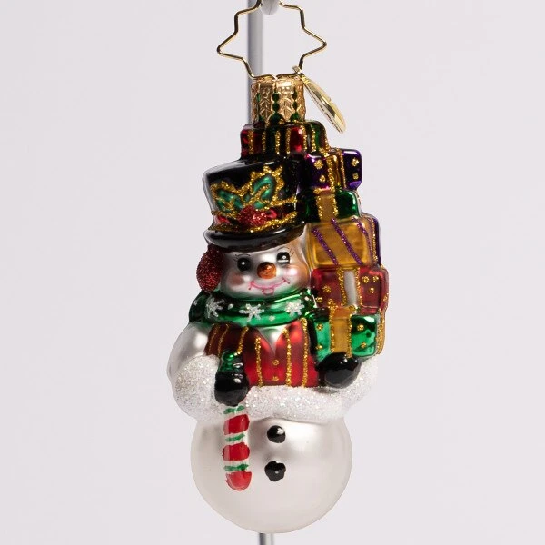 Snowmen have style and lots of class it seems, when it comes to gifting presents and fulfilling our dreams. This Christopher Radko glass gem ornament measures 3.25 inches in height.