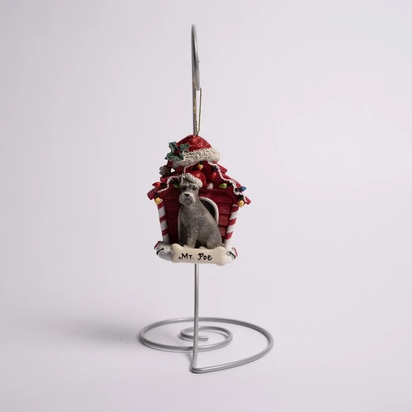 This ornament features a grey Schnauzer with a Santa hat in front of their doghouse, which is decorated in Christmas lights and has a giant Santa hat on top. In front of the Schnauzer is a big bone where you can personalize this ornament with your four legged friend’s name.