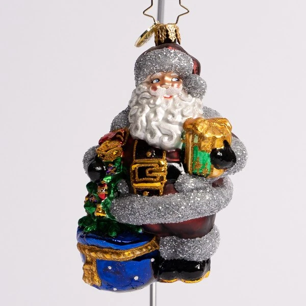 Santa is shimmering in silver galore, while loading his bag with presents and more. This Christopher Radko glass ornament measures 4 inches in height.