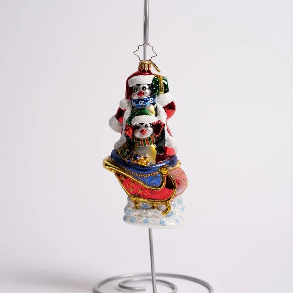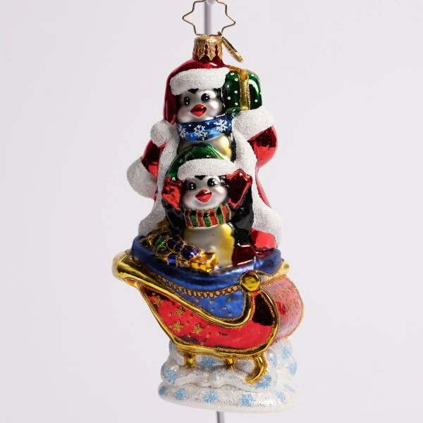 These silly penguins are taking a ride to show off for Santa before his big night. This Christopher Radko glass ornament measures 5.5 inches.