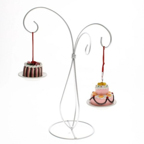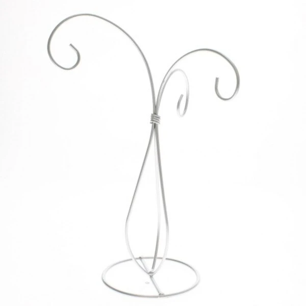 Hang ornaments, jewelry and more on this scroll ornament stand, finished in silver and designed to hold several ornaments at once with ease. Hanging Heights: 5.5″, 7″, 8.5″.