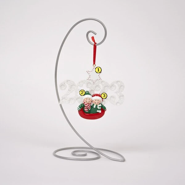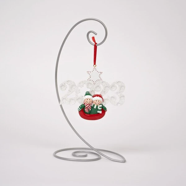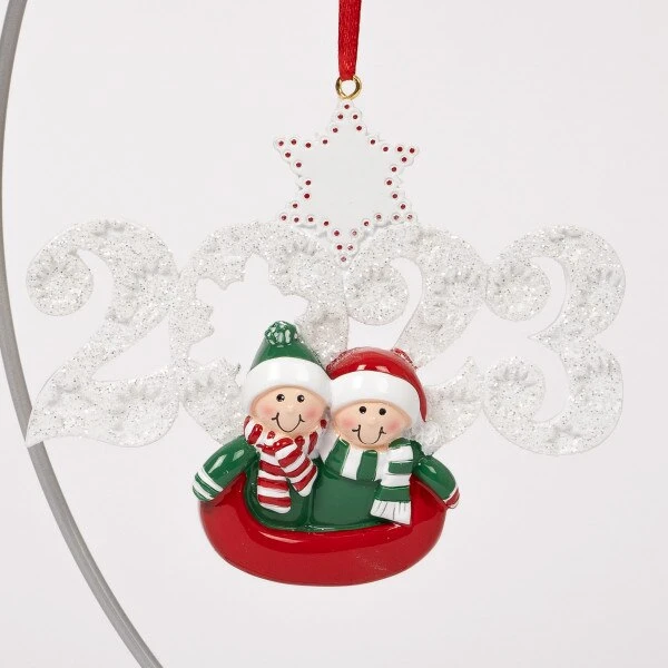 Personalizable resin ornament of a couple sledding down the slopes in a cute red sled with the year 2023 in the background. Measures 5 x .75 x 5 and weighs .11 pounds.