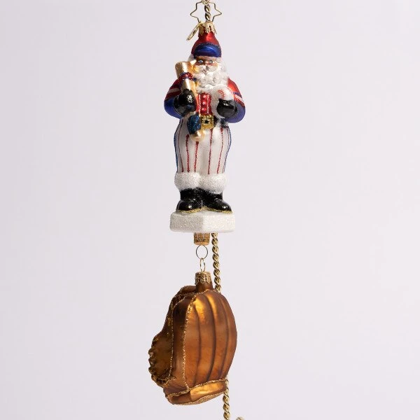 Santa is ready to play with bat and ball in hand, hanging underneath is a catcher glove. This Christopher Radko glass ornament measures 9 inches in height.