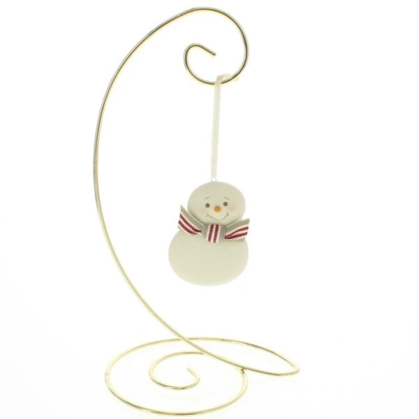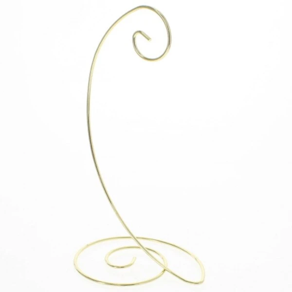 Decorative small brass colored metal ornament stand that can display your most treasured ornament any time of the year.  Measures 10in H x 5.5in W x 4.5in L.