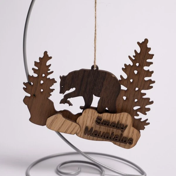 This wooden ornament features the words Smoky Mountains and shows a bear catching a fish.