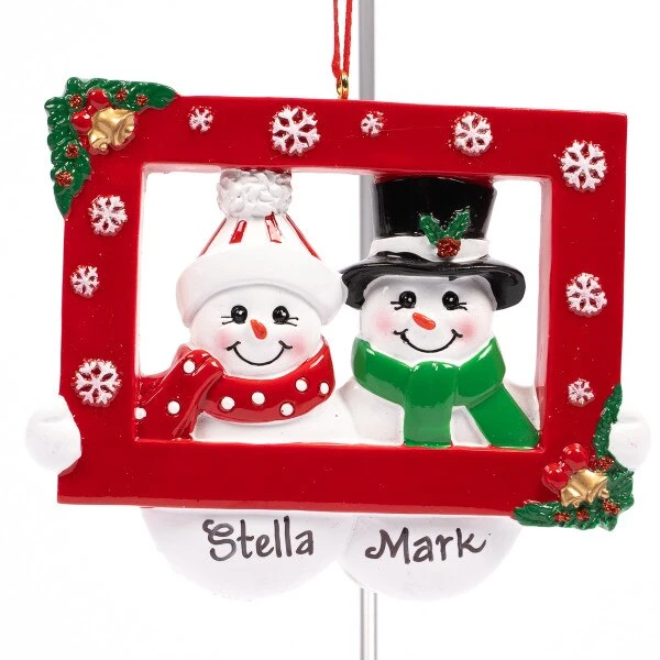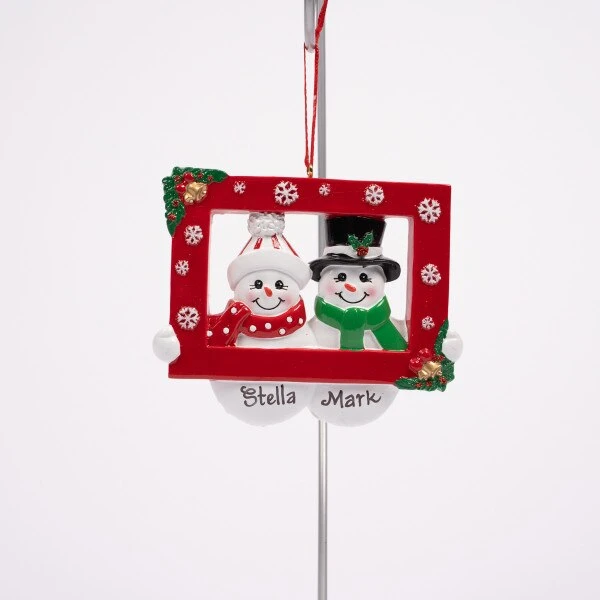 A happy snowman couple smiles while holding a red frame with snowflakes and holly. Personalize this resin ornament to place on your Christmas tree! The measurements are 4 x .5 x 2.25 inches and weighs .2 pounds. Â