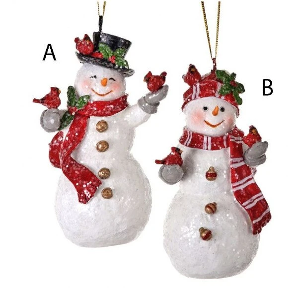 A jolly pair of sparkling snowmen visit with a few of their cardinal friends! Version A is the classic snowman with a red scarf and a black top hat! Version B, this joyful snowman has a white and red scarf and a knitted hat!Â
