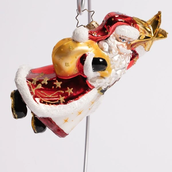 With the star shining bright and being held in his hand, Santa is ready for his trip across the land. This Christopher Radko glass ornament measures 1.5 inches in height and 5 inches long.