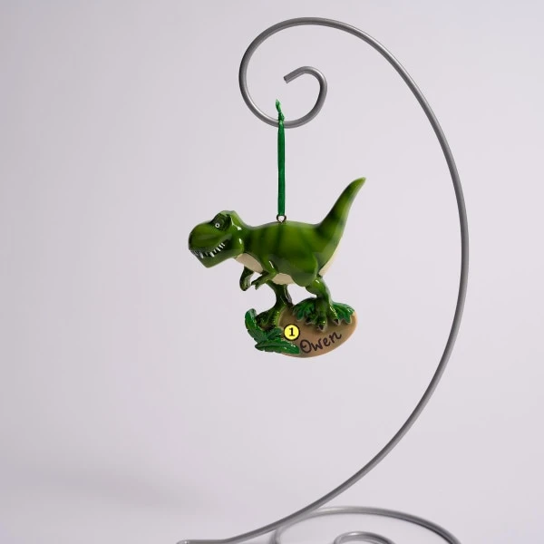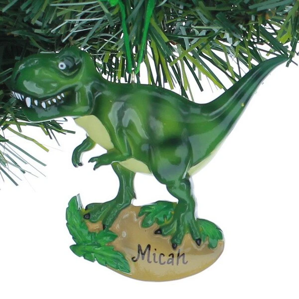 Perfect for all dinosaur lovers of all ages, this resin ornament can be personalized! The measurements for T-Rex are 3.75 x .44 x 3.25 inches and weighs .07 pounds.