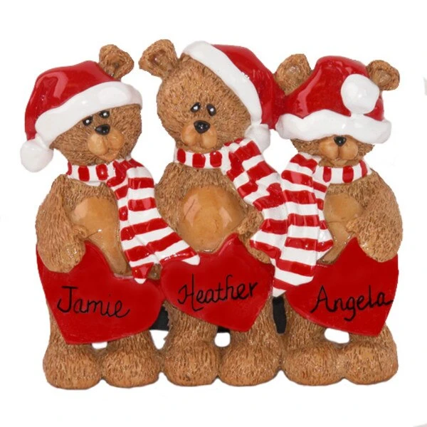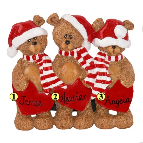 This ornament features three cute bears dressed in Santa caps and peppermint striped scarves each clutching a big read heart upon which you can personalize names.