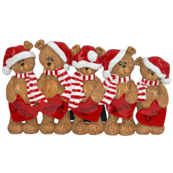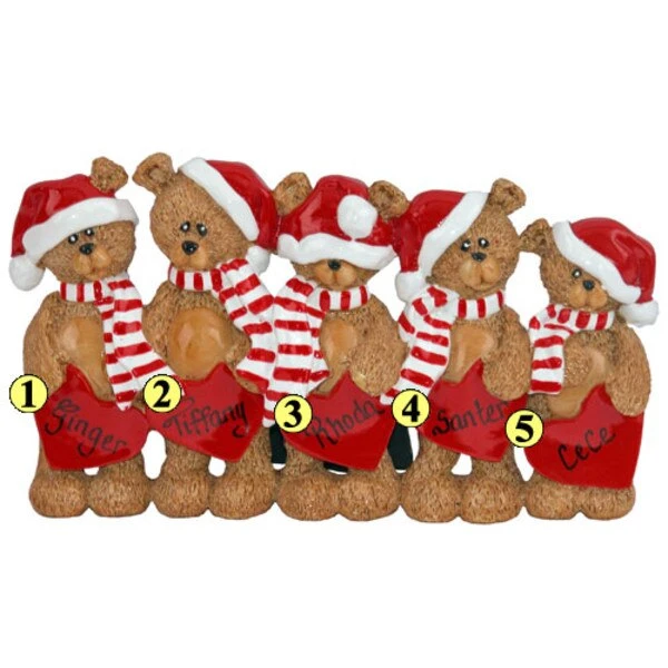 Celebrate your family this year with the adorable Teddy Bear Family. Five cute bears dressed in Santa caps and peppermint striped scarves each clutch a big read heart upon which you can personalize names.Â