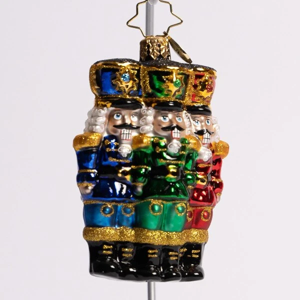 The trio of nutcrackers standing in line, to help with the holidays whenever it is time. This Christopher Radko glass gem ornament measures 3 inches in height.