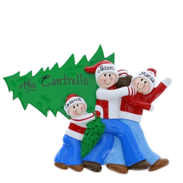 Sometimes it takes the whole family of 3 to find the perfect Christmas tree. This personalizable resin table top piece measures 5.75 inches in height.