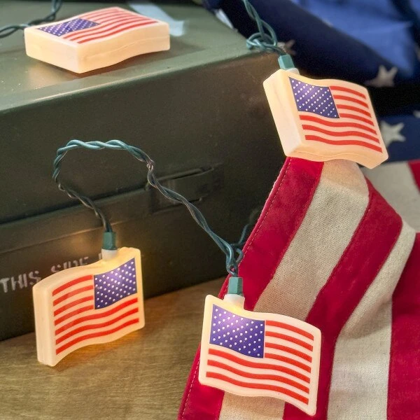 Show off your American pride with this USA flag light set by Kurt Adler! Each of the 10 light covers resembles the red, white and blue U.S. flag in a gently waving position. Great for fourth of July BBQs or any time you want to wave the flag high! Includes 4 spare bulbs and 1 spare fuse.Â