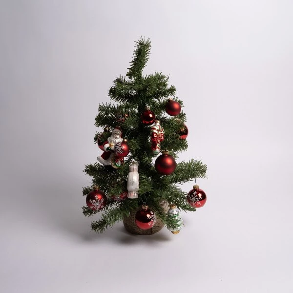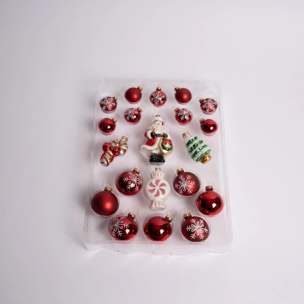 This 20 piece set of miniature ornaments feature a Santa, tree, candy cane, peppermint and 16 red ball ornaments. They are different sizes with the largest being 2.5 inches in height.