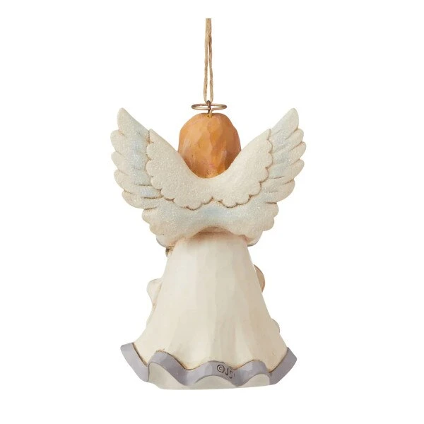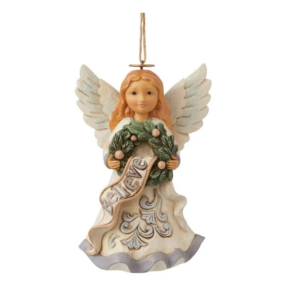 This little angel is holding a wreath and wearing a ribbon that says Believe on it. This ornament measures 4.25 inches in height.