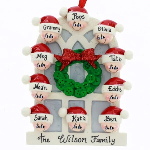 This ornament measures 4.5 inches in height and can be personalized with your family names.
