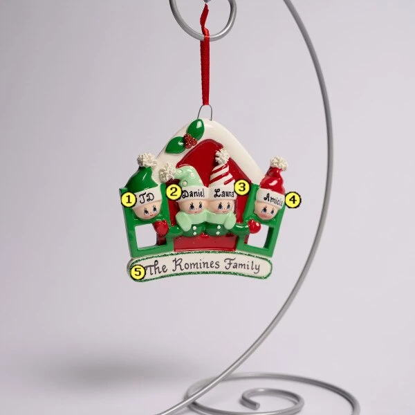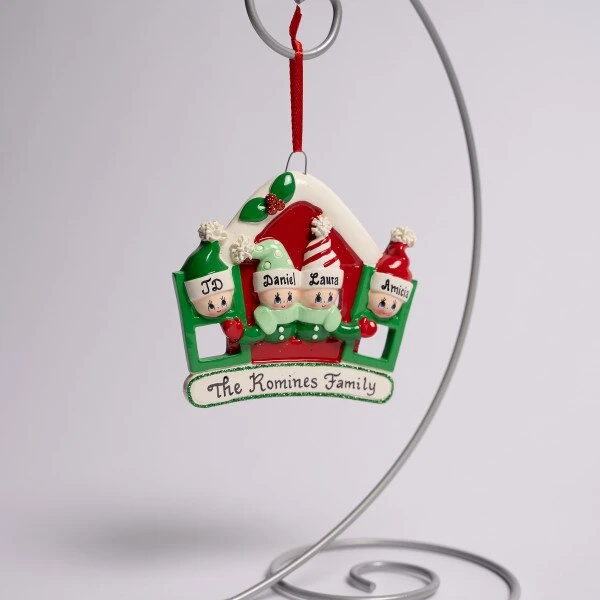 This ornament features a family of 4 celebrating the holiday together at home with the window shutters open. It can be personalized and measures 3.25 inches in height.