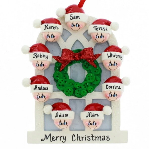 This ornament features a family of 9 hanging on a window. It can be personalized and measures 4.75 inches in height.Â