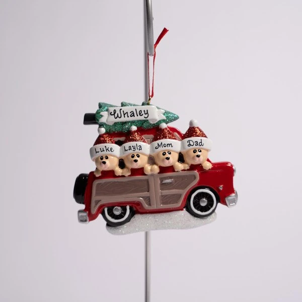 This ornament features a family of 4 riding through the country in their old woody wagon. It can be personalized and measures 3.25 inches in height.
