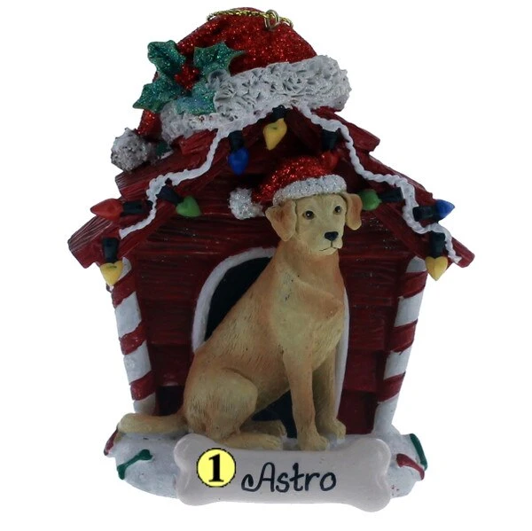 For all the Yellow Labrador lovers out there, this Kurt Adler ornament is perfect for you! It features a yellow Labrador with a Santa hat in front of their doghouse, which is decorated in Christmas lights and has a giant Santa hat on top. In front of the Lab is a big bone where you can personalize this ornament with your four legged friend’s name